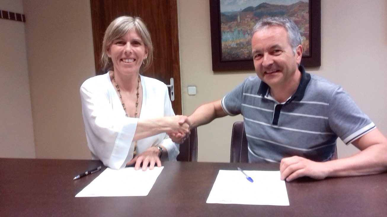 Foto: Firma de l’acord per part dels representants d’ambdues entitats, Maria Jordà (directora de la Fundació Eurofirms) i Albert Bassols (Director Financer d’Espuña).