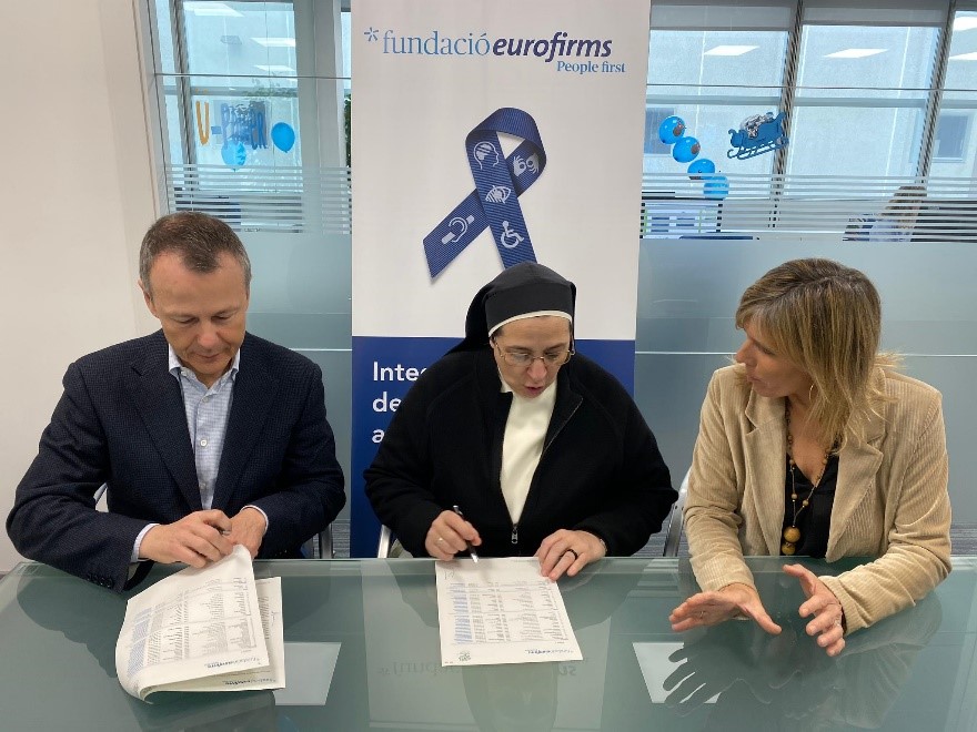 La Fundación Eurofirms, dedicada a la normalización de la discapacidad, y la Fundación del Convento de Santa Clara, que promueve la atención a personas con riesgo de exclusión social y dificultades para garantizar sus derechos como ciudadanos, han firmado un convenio de colaboración que tiene como objetivo potenciar la normalización de la discapacidad en la empresa. Maria Jordà, directora de la Fundación Eurofirms, y Sor Lucía Caram, directora de la Fundación del Convento de Santa Clara, han firmado este convenio que supone el inicio de la colaboración entre las dos entidades.